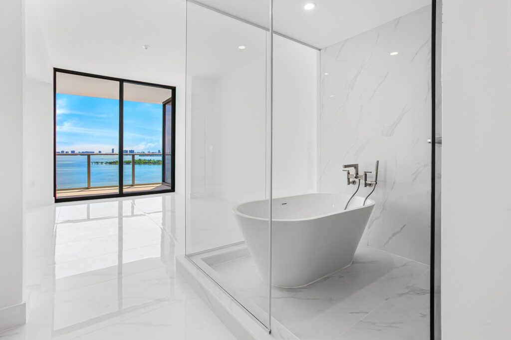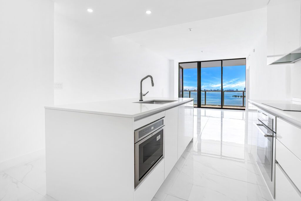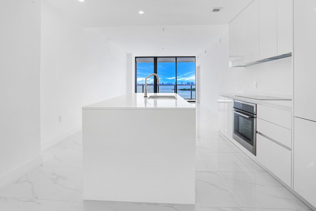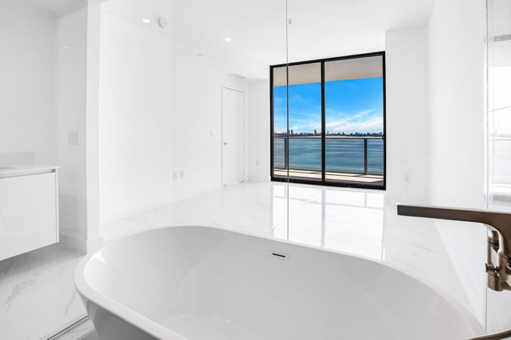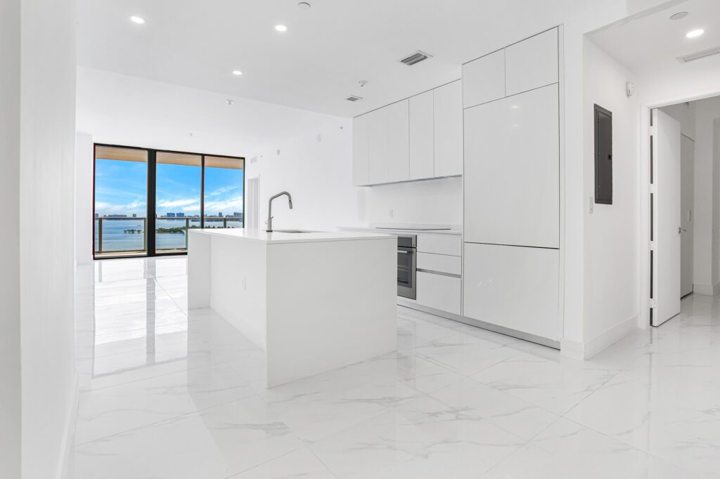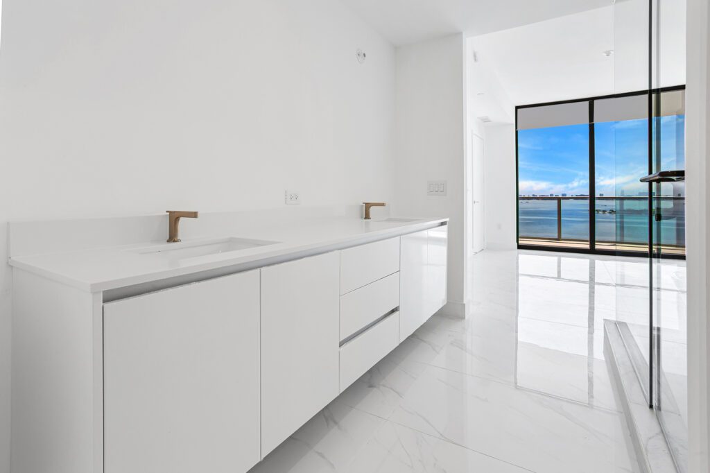 This residence features an open living and dining concept that connects seamlessly to the kitchen and terrace area. Floor-to-ceiling windows bring in abundant natural light while framing the incredible waterfront scenery that makes Edgewater one of Miami’s most sought-after residential locations.